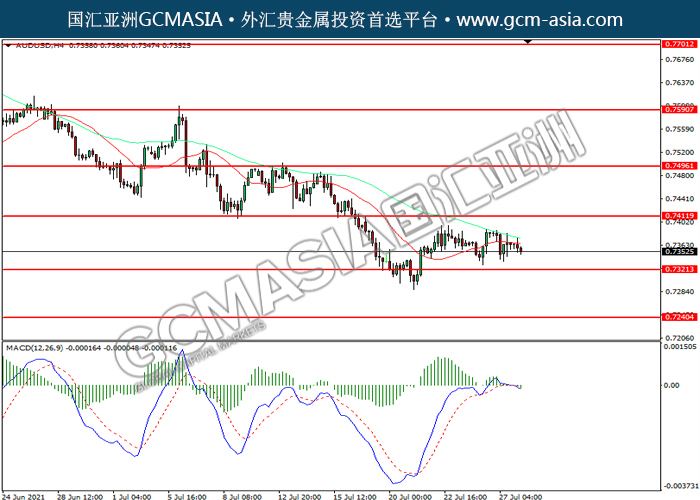 20210728 AUDUSD-午间 by willy | Jul 28, 2021 | 澳元兑美元 | 0 comments AUDUSD,H4:澳美震荡下行。MACD多头动能略减,短期可关注空头为主。上方关注0.7410压力和0.7495压力,下方关注0.7320支撑和0.7240支撑。
