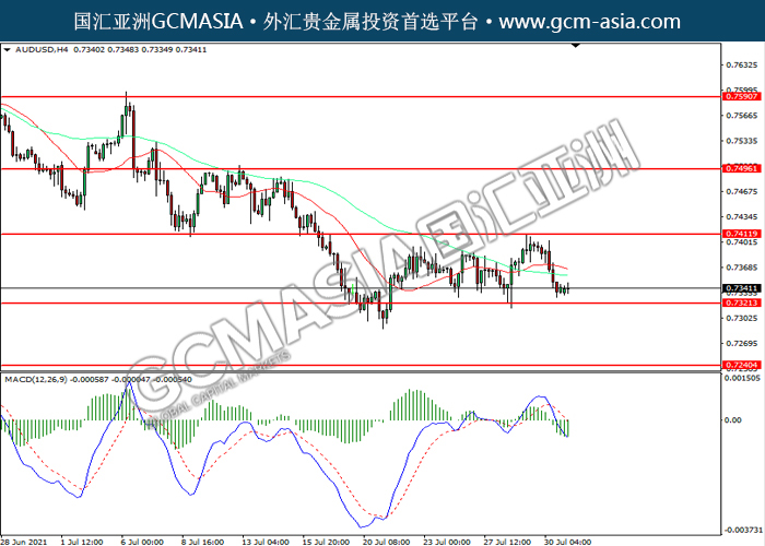 20210802 AUDUSD by willy | Aug 2, 2021 | 澳元兑美元 | 0 comments AUDUSD,H4:澳美震荡下行,目前测试前期支撑。MACD空头动能略增,若下破可关注空头为主。上方关注0.7410压力和0.7495压力,下方关注0.7320支撑和0.7240支撑。