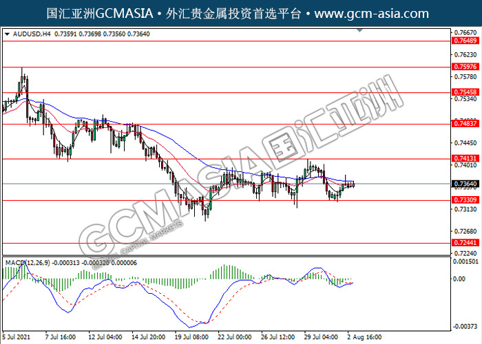 20210803 AUDUSD-午间 by keyk | Aug 3, 2021 | 澳元兑美元 | 0 comments AUDUSD,H4:澳美近期低位反弹上行。MACD形成金叉,动能略增,短期可继续看多反弹为主。上方关注0.7415压力和0.7485压力,下方关注0.7330支撑和0.7245支撑。