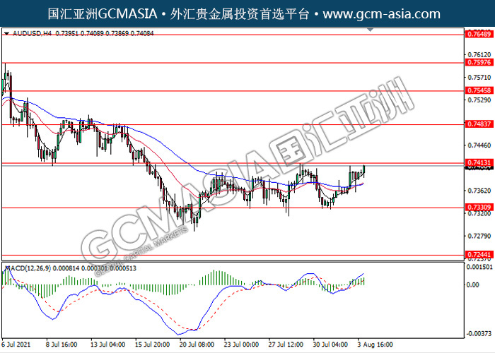 20210804 AUDUSD-午间 by keyk | Aug 4, 2021 | 澳元兑美元 | 0 comments AUDUSD,H4:澳美近期低位反弹上行,目前测试前期压力。MACD动能持续略增,若突破继续看多为主。上方关注0.7415压力和0.7485压力,下方关注0.7330支撑和0.7245支撑。