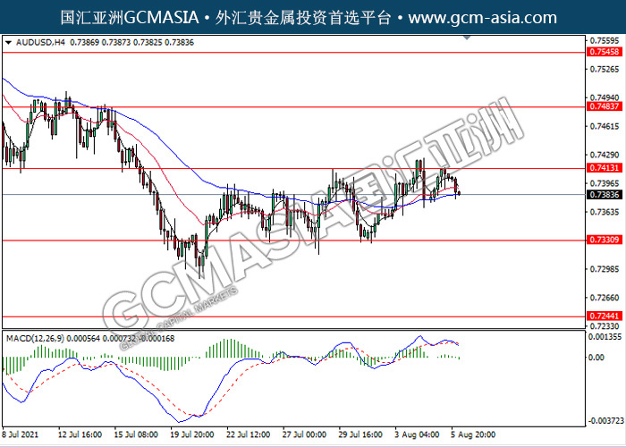 AUDUSD,H4:澳美高位承压回落。MACD形成死叉,动能略减,短期继续看空回调为主。上方关注0.7415压力和0.7485压力,下方关注0.7330支撑和0.7245支撑。