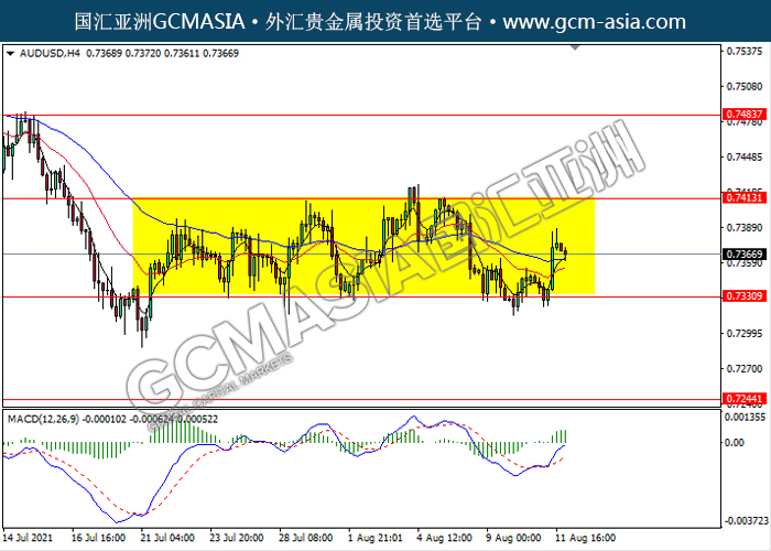 20210812 AUDUSD-午间 by keyk | Aug 12, 2021 | 澳元兑美元 | 0 comments AUDUSD,H4:澳美仍区间震荡交易,近期低位反弹上行。然而,MACD形成金叉,动能略增,短期可关注多头方向为主。上方关注0.7415压力和0.7485压力,下方关注0.7330支撑和0.7245支撑。