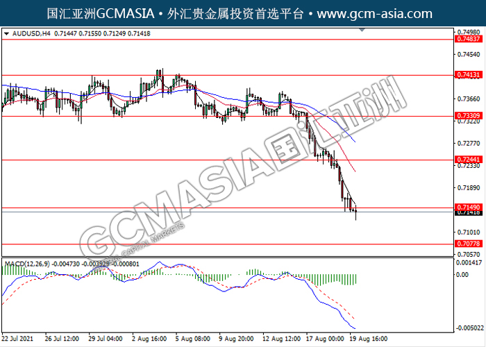 20210821 AUDUSD-午间 by keyk | Aug 20, 2021 | 澳元兑美元 | 0 comments AUDUSD,H4:澳美突破前期支撑,空头排列。MACD动能持续略减,中期继续看空为主。上方关注0.7150压力和0.7245压力,下方关注0.7075支撑和0.7000支撑。