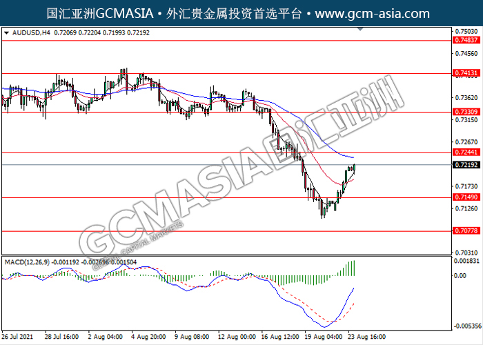 20210824 AUDUSD-午间 by keyk | Aug 24, 2021 | 澳元兑美元 | 0 comments AUDUSD,H4:澳美多头排列,目前测试靠近前期压力。MACD动能略增,若突破可继续看多为主。上方关注0.7245压力和0.7330压力,下方关注0.7150支撑和0.7075支撑。