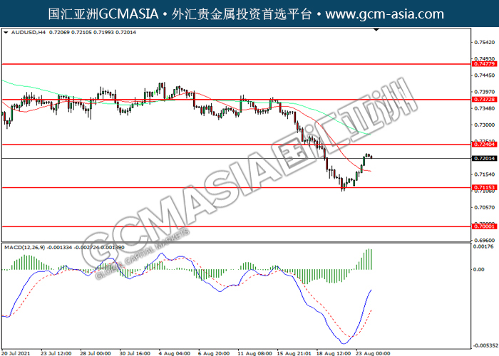 20210824 AUDUSD by willy | Aug 24, 2021 | 澳元兑美元 | 0 comments AUDUSD,H4:澳美震荡下行,目前测试前期支撑。MACD空头动能略增,若下破可关注空头为主。上方关注0.7240压力和0.7375压力,下方关注0.7115支撑和0.7000支撑。