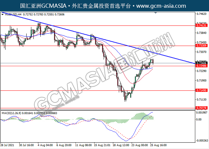 20210826 AUDUSD-午间 by keyk | Aug 26, 2021 | 澳元兑美元 | 0 comments AUDUSD,H4:澳美高位承压回落,目前测试靠近前期支撑。MACD多头动能略减,若突破可继续看空为主。上方关注0.7330压力和0.7415压力,下方关注0.7250支撑和0.7150支撑。