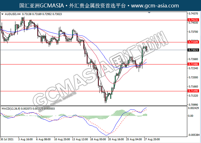 20210830 AUDUSD-午间 by keyk | Aug 30, 2021 | 澳元兑美元 | 0 comments AUDUSD,H4:澳美多头排列,目前测试靠近前期压力。然而,MACD多头动能略减,短期关注技术性空头回调为主。上方关注0.7330压力和0.7415压力,下方关注0.7250支撑和0.7150支撑。