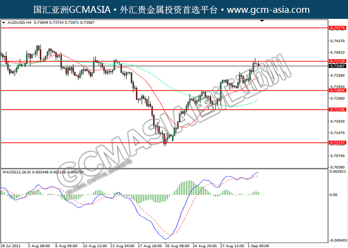 20210902 AUDUSD by willy | Sep 2, 2021 | 澳元兑美元 | 0 comments AUDUSD,H4:澳美突破前期压力,持续上行。然而,MACD空头动能略增,短期可关注技术性回调为主。上方关注0.7375压力和0.7480压力,下方关注0.7280支撑和0.7220支撑。