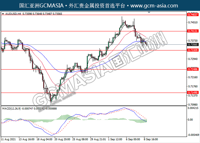 AUDUSD,H4:澳美震荡下行,目前测试靠近前期支撑。MACD动能持续略减,若突破可继续看空为主。上方关注0.7415压力和0.7485压力,下方关注0.7330支撑和0.7250支撑。