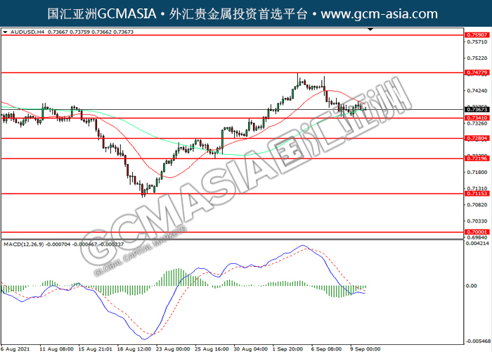 20210910 AUDUSD by willy | Sep 10, 2021 | 澳元兑美元 | 0 comments AUDUSD,H4:澳美震荡下行,目前测试前期支撑。然而,MACD空头动能略减,短期可关注技术性回调为主。上方关注0.7475压力和0.7590压力,下方关注0.7340支撑和0.7280支撑。