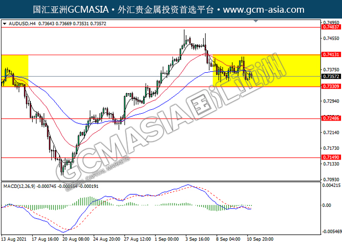 20210913 AUDUSD-午间 by keyk | Sep 13, 2021 | 澳元兑美元 | 0 comments AUDUSD,H4:澳美仍区间震荡交易,目前测试靠近前期支撑。然而,MACD空头动能略减,短期关注多头方向为主。上方关注0.7415压力和0.7485压力,下方关注0.7330支撑和0.7250支撑。