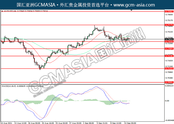 20210914 AUDUSD by willy | Sep 14, 2021 | 澳元兑美元 | 0 comments AUDUSD,H4:澳美震荡下行,目前测试前期支撑。然而,MACD空头动能略减,短期可关注技术性回调为主。上方关注0.7475压力和0.7590压力,下方关注0.7340支撑和0.7280支撑。