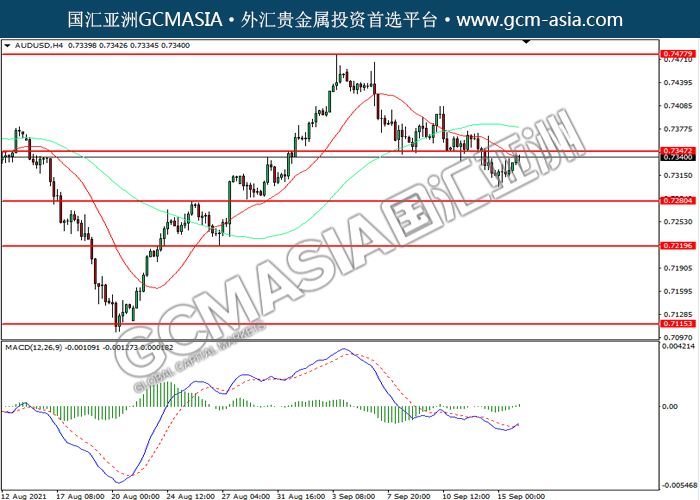 20210916 AUDUSD by willy | Sep 16, 2021 | 澳元兑美元 | 0 comments AUDUSD,H4:澳美震荡上行,目前测试前期压力。MACD多头动能略增,若突破可关注多头为主。上方关注0.7345压力和0.7480压力,下方关注0.7280支撑和0.7220支撑。