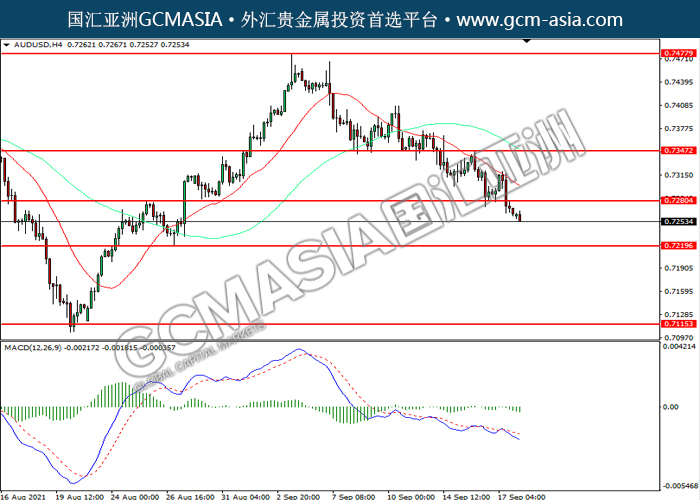 20210920 AUDUSD by willy | Sep 20, 2021 | 澳元兑美元 | 0 comments AUDUSD,H4:澳美震荡下行。MACD空头动能略增,若突破可关注空头为主。上方关注0.7280压力和0.7345压力,下方关注0.7220支撑和0.7115支撑。