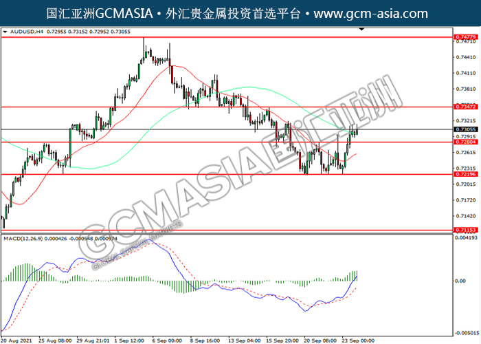 AUDUSD,H4:澳美突破前期压力,震荡上行。MACD多头动能略增,短期可关注多头为主。上方关注0.7345压力和0.7480压力,下方关注0.7280支撑和0.7220支撑。