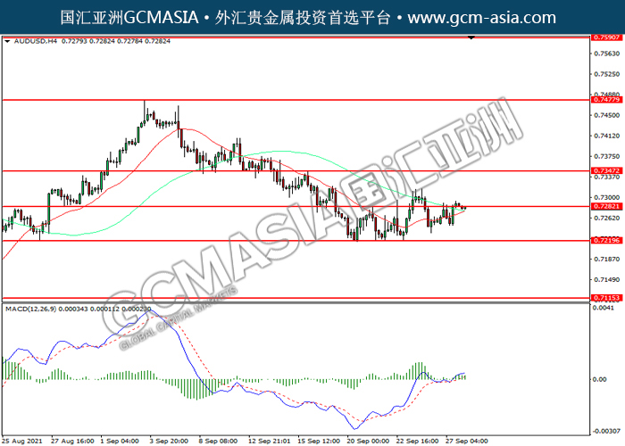 20210928 AUDUSD by willy | Sep 28, 2021 | 澳元兑美元 | 0 comments AUDUSD,H4:澳美震荡上行,目前测试前期压力。然而,MACD多头动能略减,短期可关注技术性回调为主。上方关注0.7280压力和0.7345压力,下方关注0.7220支撑和0.7115支撑。