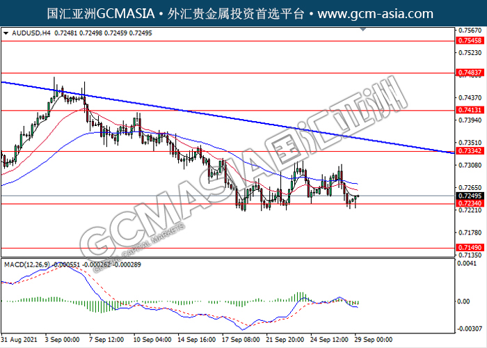 AUDUSD,H4:澳元震荡下行,目前测试前期支撑。然而,MACD空头动能略减,短期关注技术性多头反弹趋势为主。上方关注0.7335压力和0.7415压力,下方关注0.7235支撑和0.7150支撑。