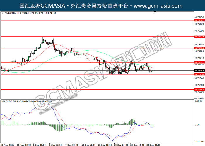 AUDUSD,H4:澳美震荡下行,目前测试前期支撑。然而,MACD空头动能略减,短期可关注技术性回调为主。上方关注0.7300压力和0.7400压力,下方关注0.7220支撑和0.7115支撑。