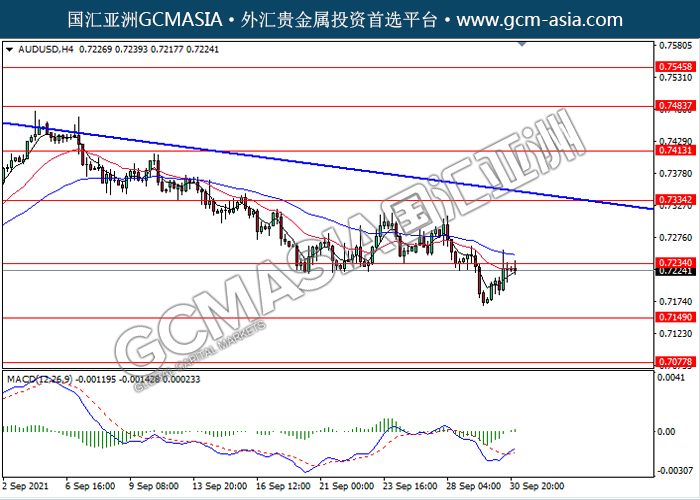 AUDUSD,H4:澳元低位反弹上行,目前测试前期压路。MACD形成金叉,动能略增,若突破可继续看多为主。上方关注0.7235压力和0.7335压力,下方关注0.7150支撑和0.7075支撑。