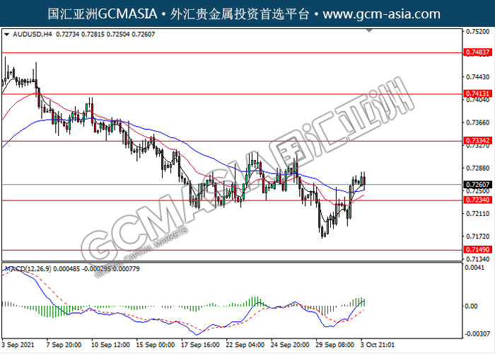 20211004 AUDUSD-午间 by keyk | Oct 4, 2021 | 澳元兑美元 | 0 comments AUDUSD,H4:澳元突破前期压力,多头排列。MACD动能略增,短期可继续看多为主。上方关注0.7335压力和0.7415压力,下方关注0.7235支撑和0.7150支撑。