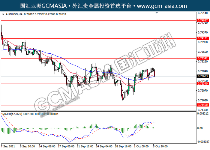 20211006 AUDUSD-午间 by keyk | Oct 6, 2021 | 澳元兑美元 | 0 comments AUDUSD,H4:澳元高位承压回落,目前测试靠近前期支撑。MACD多头动能略减,若突破继续看空为主。上方关注0.7335压力和0.7415压力,下方关注0.7235支撑和0.7150支撑。