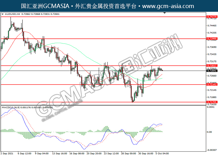 20211006 AUDUSD by keyk | Oct 6, 2021 | 澳元兑美元 | 0 comments AUDUSD,H4:澳美突破前期压力,震荡上行。然而,MACD多头动能略减,短期可关注技术性回调为主。上方关注0.7300压力和0.7400压力,下方关注0.7235支撑和0.7170支撑。