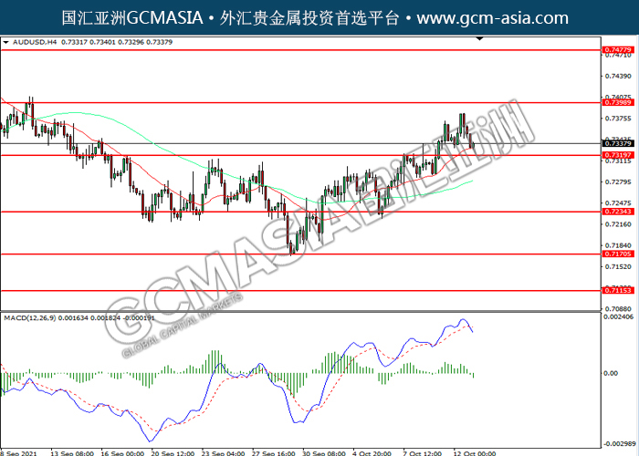 20211013 AUDUSD by willy | Oct 13, 2021 | 澳元兑美元 | 0 comments AUDUSD,H4:澳美震荡下行,目前测试前期支撑。MACD空头动能略增,若下破可关注空头为主。上方关注0.7400压力和0.7480压力,下方关注0.7320支撑和0.7235支撑。