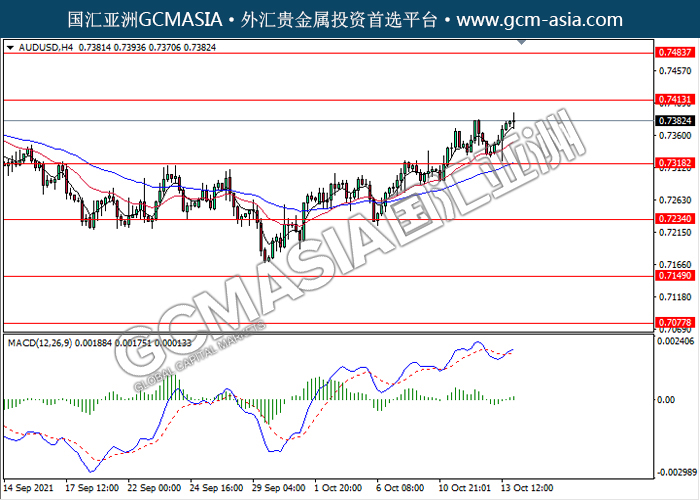 20211014 AUDUSD-午间 by keyk | Oct 14, 2021 | 澳元兑美元 | 0 comments AUDUSD,H4:澳元震荡上行,目前测试靠近前期压力。MACD形成金叉,动能略增,若突破可继续看多为主。上方关注0.7415压力和0.7485压力,下方关注0.7320支撑和0.7535支撑。