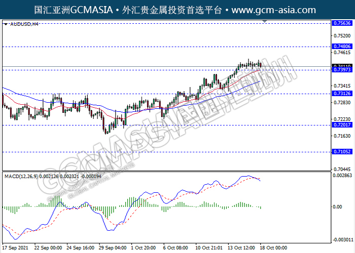 20211018 AUDUSD-午间 by keyk | Oct 18, 2021 | 澳元兑美元 | 0 comments AUDUSD,H4:澳美震荡盘,目前测试前期支撑。然而,MACD形成死叉,动能略减,若突破可关注空头方向为主。上方关注0.7480压力和0.7565压力,下方关注0.7395支撑和0.7310支撑。
