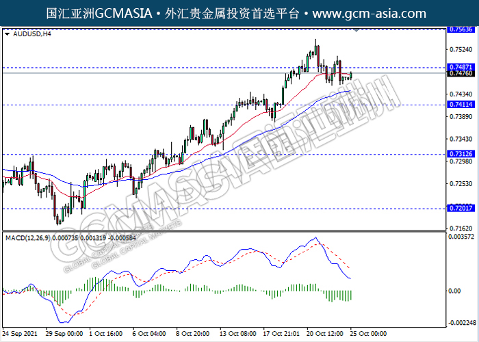 20211025 AUDUSD-午间 by keyk | Oct 25, 2021 | 澳元兑美元 | 0 comments AUDUSD,H4:澳美震荡盘整,目前测试前期压力。然而,MACD显示多头信号,空头动能有所略减,若突破可关注多头趋势为主。上方关注0.7485压力和0.7565压力,下方关注0.7410支撑和0.7310支撑。