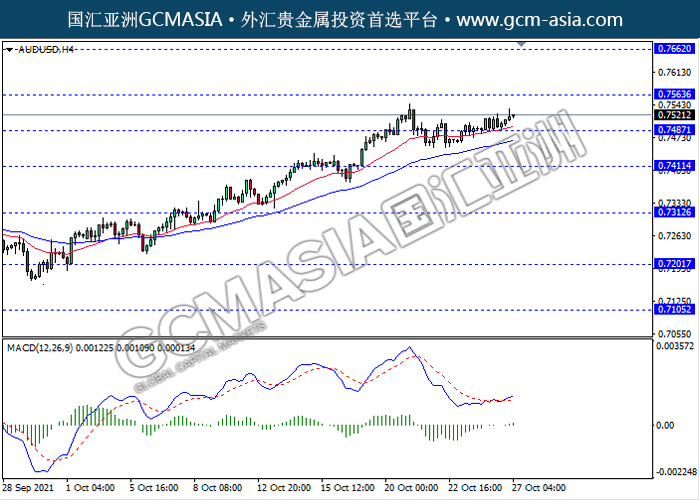 20211027 AUDUSD-午间 by willy | Oct 27, 2021 | 澳元兑美元 | 0 comments AUDUSD,H4:澳美低位反弹上行。然而,MACD形成金叉,动能略增,短期继续看多为主。上方关注0.7565压力和0.7660压力,下方关注0.7485支撑和0.7410支撑。