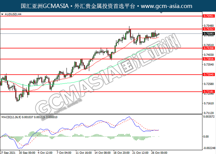 20211027 AUDUSD by willy | Oct 27, 2021 | 澳元兑美元 | 0 comments AUDUSD,H4:澳美震荡上行,目前测试前期压力。MACD多头动能略增,短期可关注多头为主。上方关注0.7530压力和0.7595压力,下方关注0.7435支撑和0.7380支撑。
