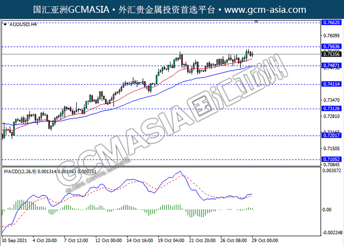 20211029 AUDUSD-午间 by willy | Oct 29, 2021 | 澳元兑美元 | 0 comments AUDUSD,H4:澳美震荡上行,目前测试靠近前期呀路。然而,MACD多头动能略减,短期继续看空回调为组。上方关注0.7565压力和0.7660压力,下方关注0.7485支撑和0.7410支撑。