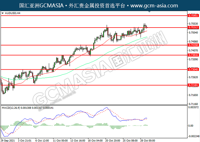 20211029 AUDUSD by willy | Oct 29, 2021 | 澳元兑美元 | 0 comments AUDUSD,H4:澳美震荡上行,目前测试前期压力。然而,MACD多头动能略减,短期可关注技术性回调为主。上方关注0.7530压力和0.7595压力,下方关注0.7435支撑和0.7380支撑。