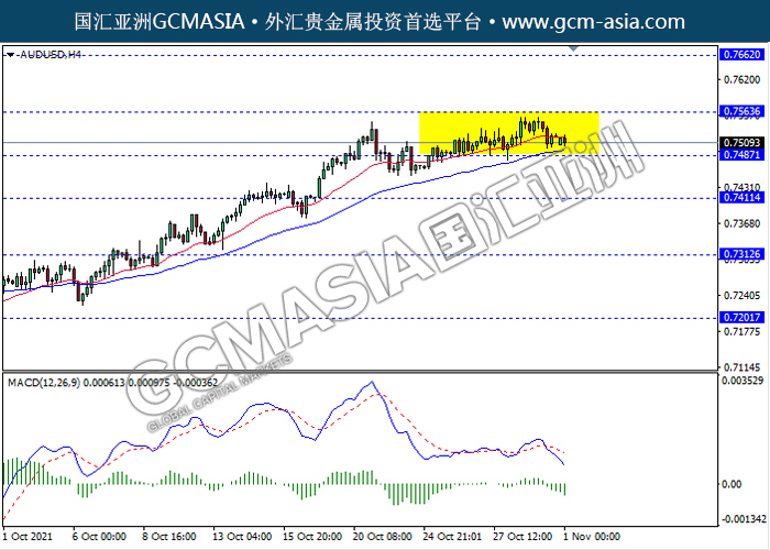 20211101 AUDUSD-午间 by willy | Nov 1, 2021 | 澳元兑美元 | 0 comments AUDUSD,H4:澳美仍区间震荡盘,目前测试靠近前期支撑。然而,MACD动能略减,若突破可关注空头方向为主。上方关注0.7565压力和0.7660压力,下方关注0.7485支撑和0.7410支撑。
