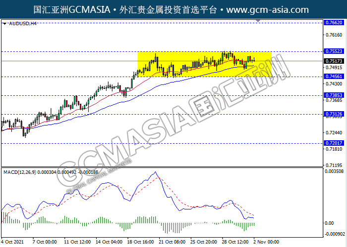 20211102 AUDUSD-午间 by willy | Nov 2, 2021 | 澳元兑美元 | 0 comments AUDUSD,H4:澳美仍区间震荡盘。然而,MACD显示空头信号,动能略减,短期可关注空头趋势为主。上方关注0.7550压力和0.7660压力,下方关注0.7455支撑和0.7385支撑。