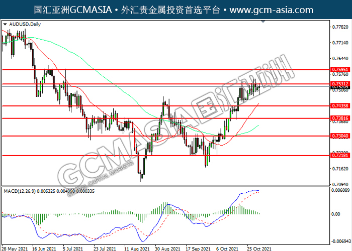 20211102 AUDUSD by willy | Nov 2, 2021 | 澳元兑美元 | 0 comments AUDUSD,Daily:澳美震荡上行,目前测试前期压力。然而,MACD多头动能略减,短期可关注技术性回调为主。上方关注0.7530压力和0.7595压力,下方关注0.7435支撑和0.7380支撑。