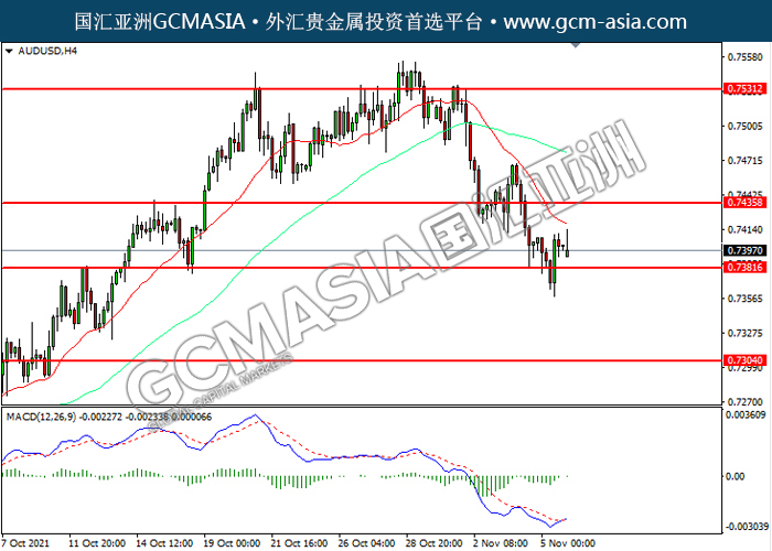 20211108 AUDUSD by willy | Nov 8, 2021 | 澳元兑美元 | 0 comments AUDUSD,H4:澳美震荡下行,目前测试前期支撑。然而,MACD空头动能略减,短期可关注技术性回调为主。上方关注0.7435压力和0.7530压力,下方关注0.7380支撑和0.7305支撑。