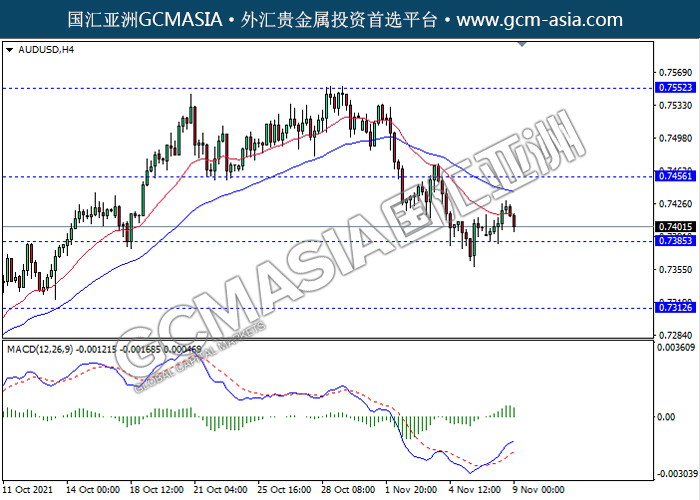 20211109 AUDUSD-午间 by willy | Nov 9, 2021 | 澳元兑美元 | 0 comments AUDUSD,H4:澳美高位承压回落,目前测试靠近前期支撑。MACD多头动能略减,若突破可继续看空方向为主。上方关注0.7455压力和0.7550压力,下方关注0.7385支撑和0.7310支撑。
