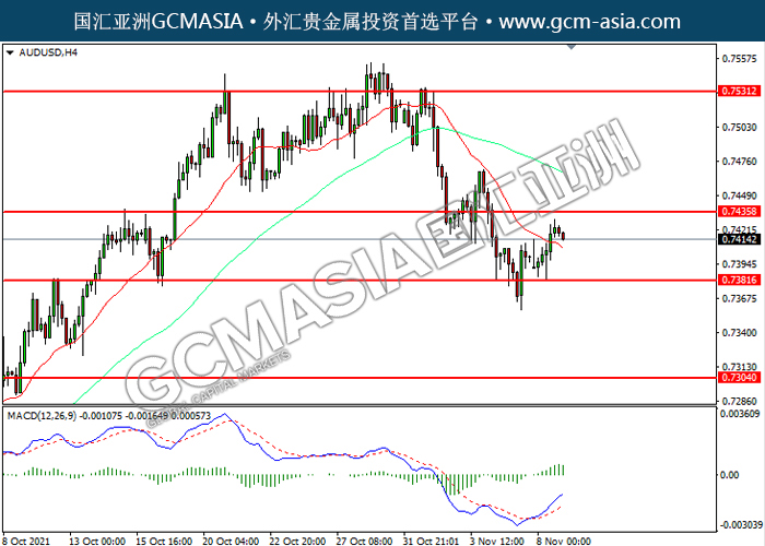 AUDUSD,H4:澳美震荡上行,目前测试前期压力。MACD多头动能略增,若突破可关注多头为主。上方关注0.7435压力和0.7530压力,下方关注0.7380支撑和0.7305支撑。