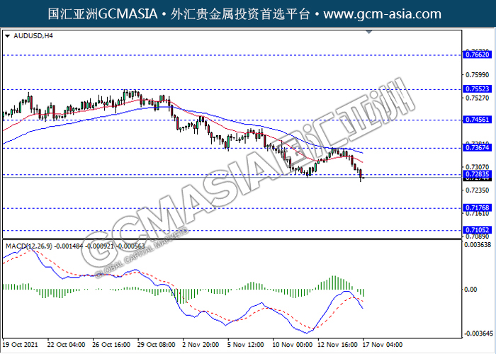 20211117 AUDUSD-午间 by willy | Nov 17, 2021 | 澳元兑美元 | 0 comments AUDUSD,H4:澳美突破前期支撑,震荡下行。MACD形成死叉,动能略减,若突破继续看空为主。上方关注0.7285压力和0.7365压力,下方关注0.7175支撑和0.7105支撑。