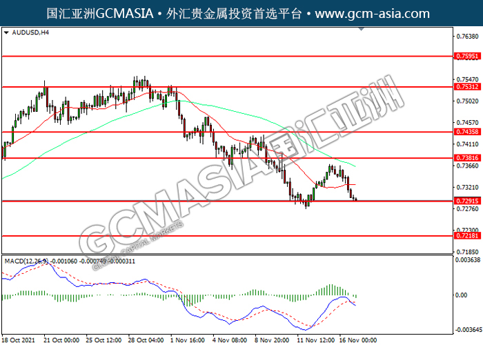 20211117 AUDUSD by willy | Nov 17, 2021 | 澳元兑美元 | 0 comments AUDUSD,H4:澳美震荡上行,目前测试前期压力。然而,MACD多头动能略减,短期可关注技术性回调为主。上方关注0.7380压力和0.7435压力,下方关注0.7290支撑和0.7220支撑。