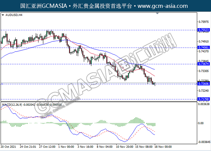 AUDUSD,H4:澳美震荡下行,目前测试前期支撑。MACD动能持续略减,若突破可继续看空为主。上方关注0.7365压力和0.7455压力,下方关注0.7260支撑和0.7175支撑。