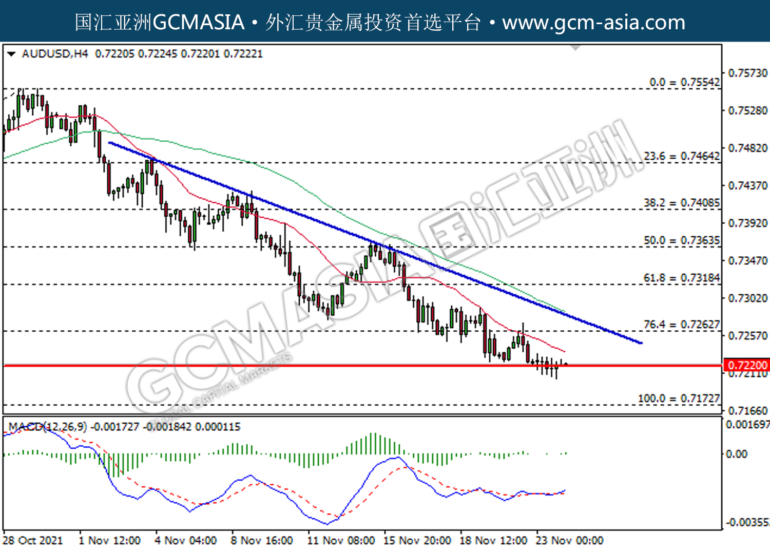 20211124 AUDUSD by willy | Nov 24, 2021 | 澳元兑美元 | 0 comments AUDUSD, H4:澳美震荡下行。然而,MACD已形成金叉,动能偏强,短期关注技术性回调。上方关注0.7260压力和0.7320压力,下方关注0.7220支撑和0.7170支撑。