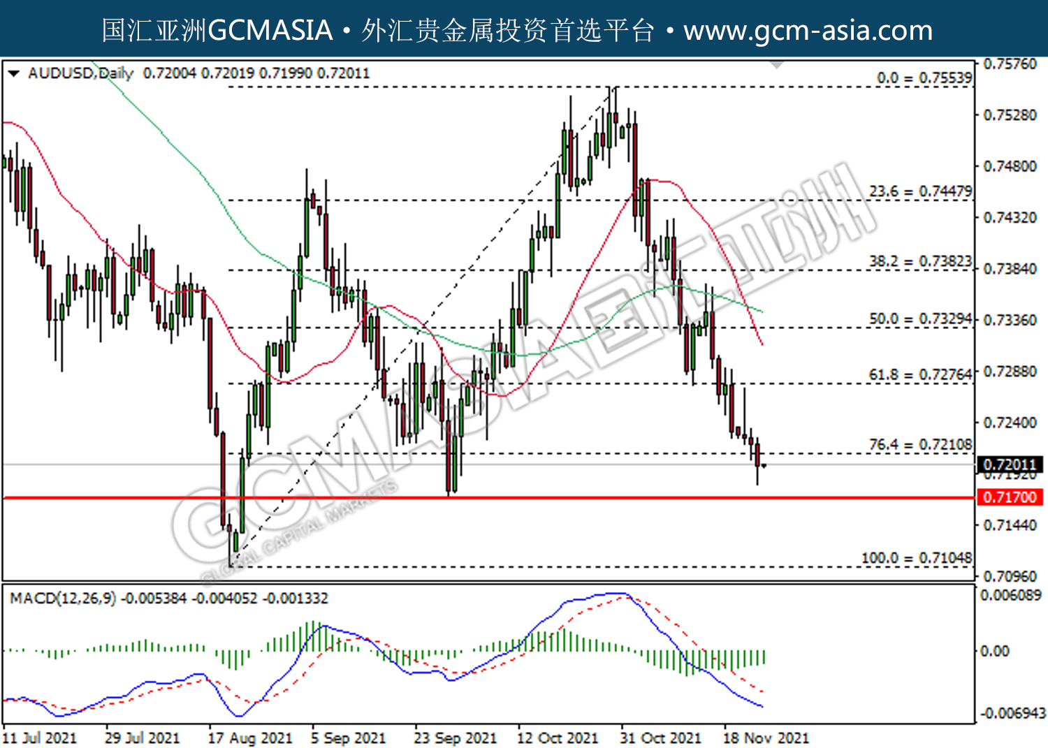 20211125 AUDUSD by willy | Nov 25, 2021 | 澳元兑美元 | 0 comments AUDUSD, Daily:澳美震荡下行。然而,MACD空头动能有所略减,短期关注技术性回调。上方关注0.7210压力和0.7275压力,下方关注0.7170支撑和0.7105支撑。