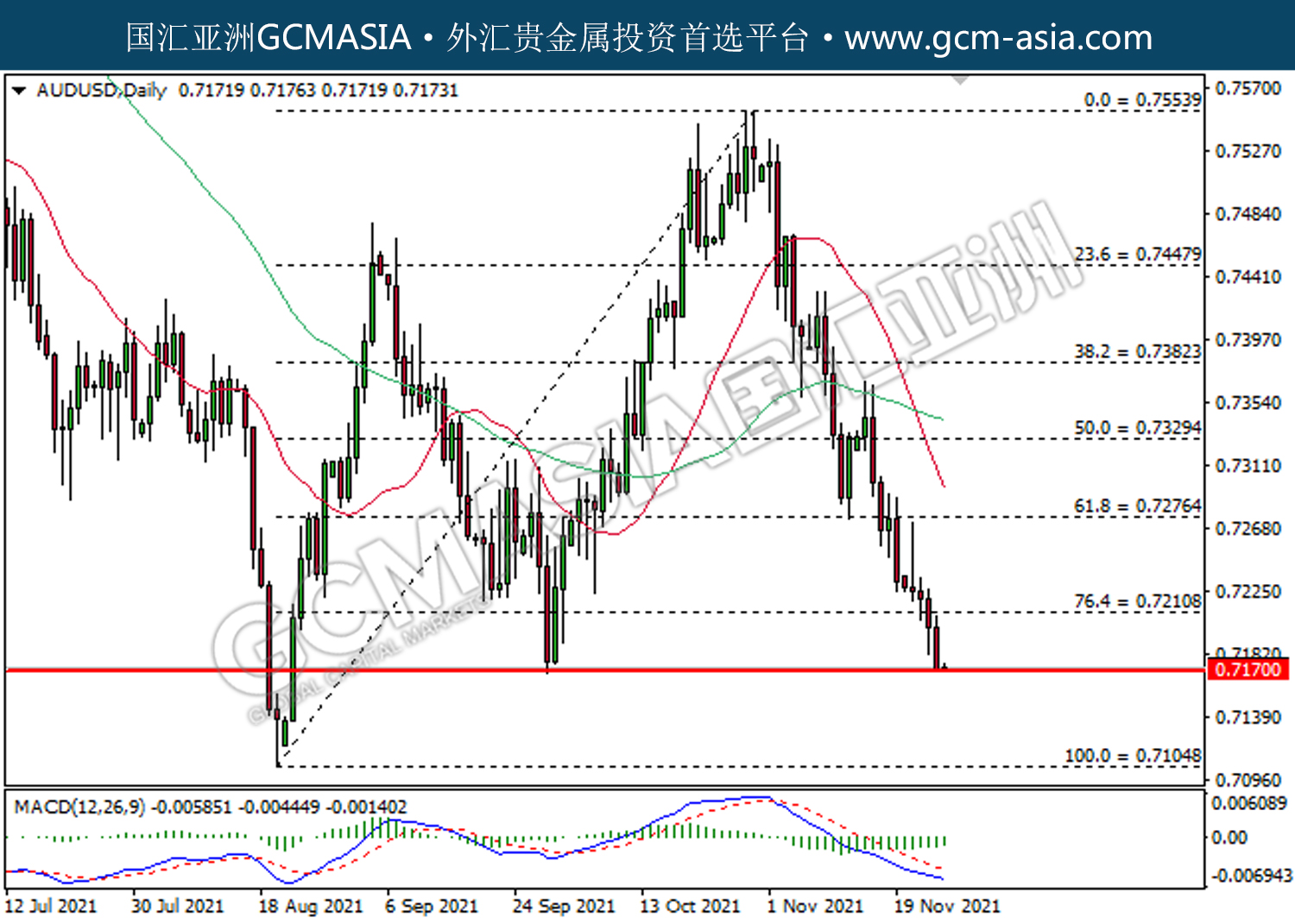 AUDUSD, Daily:澳美震荡下行。MACD依然显示空头信号,若下破可关注空头为主。上方关注0.7210压力和0.7275压力,下方关注0.7170支撑和0.7105支撑。