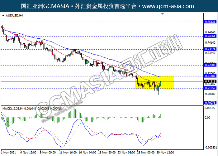 20211201 AUDUSD-午间 by keyk | Dec 1, 2021 | 澳元兑美元 | 0 comments AUDUSD,H4:澳美仍区间震荡交易,近期低位反弹上行。然而,MACD显示多头信号,动能持续略增,短期可继续关注多头反弹为主。上方关注0.7190压力和0.7260压力,下方关注0.7105支撑和0.7005支撑。
