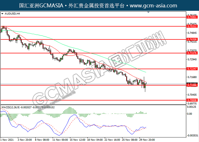 AUDUSD,H4:澳美震荡下行,目前测试前期支撑。然而,MACD多头动能略增,短期可关注技术性回调为主。上方关注0.7225压力和0.7335压力,下方关注0.7110支撑和0.7000支撑。