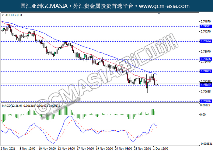 20211202 AUDUSD-午间 by keyk | Dec 2, 2021 | 澳元兑美元 | 0 comments AUDUSD,H4:澳美震荡下行,目前测试支撑。MACD多头动能略减,若突破可继续看空为主。上方关注0.7190压力和0.7260压力,下方关注0.7105支撑和0.7005支撑。
