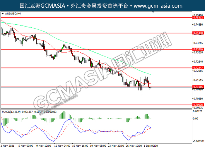 20211202 AUDUSD by willy | Dec 2, 2021 | 澳元兑美元 | 0 comments AUDUSD,H4:澳美震荡下行,目前测试前期支撑。MACD多头动能略减,若下破可关注空头为主。上方关注0.7225压力和0.7335压力,下方关注0.7110支撑和0.7000支撑。